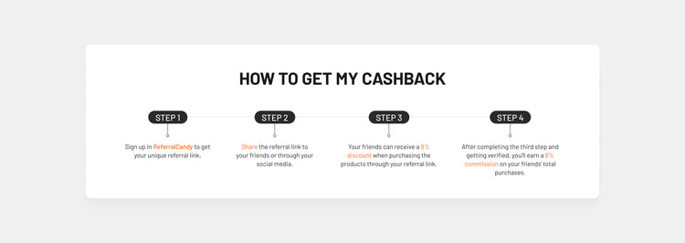As the referrer, you earn 8% cashback when someone you refer makes a purchase using your unique referral link and retains their purchase for 45 days without a return or refund.